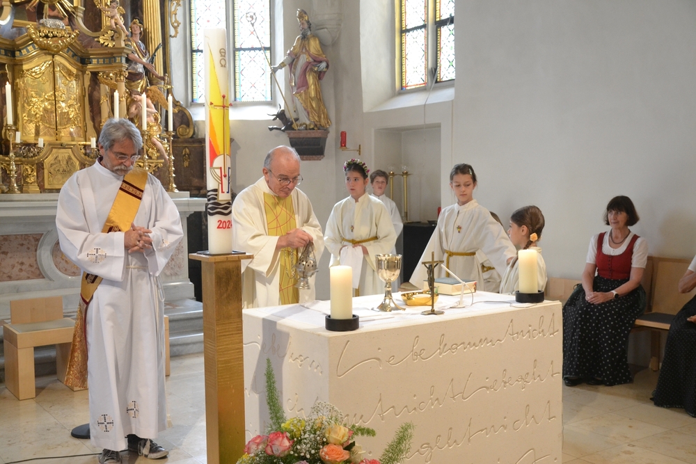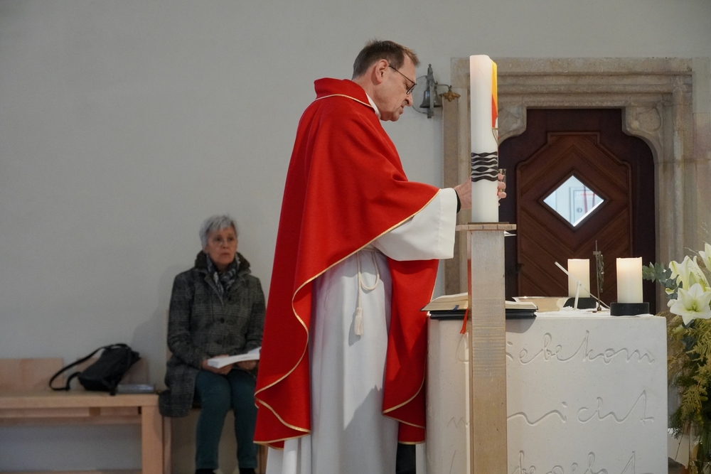 Die Auferstehungsfeier zelebrierten Vikar Gerhard Hatzmann und Diakon Michi Zepf, zusammen mit den Minis, den Lektorinnen und Lektoren, mit Kantor und Kantorin, der Musikgruppe und allen Gläubigen.